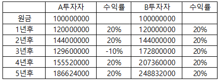 아래 그림은 똑같은 원금 1억을 가지고 투자했을 때, A와 B의 결과를 비교한 것인데,