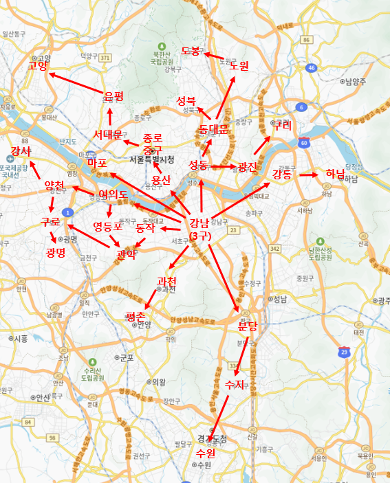 혹은 강남3구에서 부터 시작하는 지역에 따라서도 나눠볼 수 있겠다.