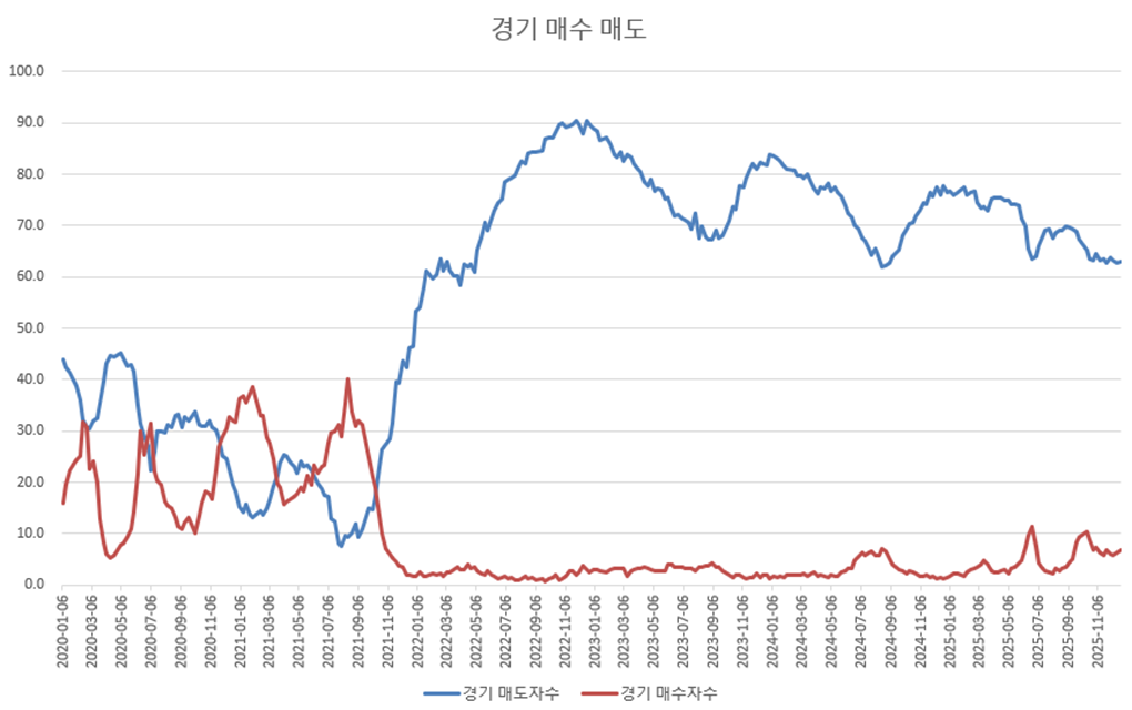 경기도는 매수세가 약간은 올라가는 모습이고, 매도세가 약간은 떨어지는 모습이지만 큰 변화는 없다.