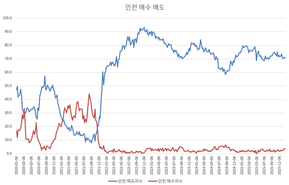 인천은 매수세가 약간 올라가는 모습을 보이는 것 같은데, 아직까지는 큰 변화는 없다.