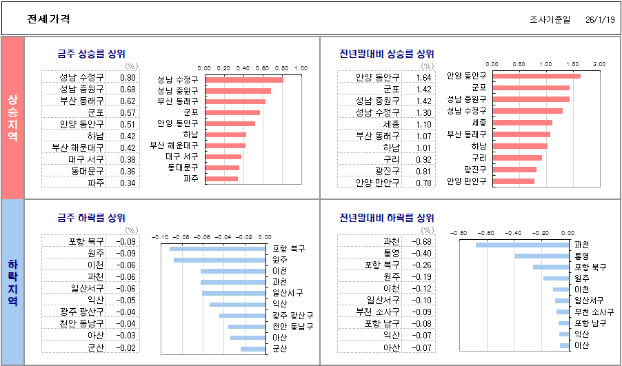 - 경기도 전세 상승 Top3 : 성남 수정구(0.80), 성남 중원구(0.68), 군포시(0.57)