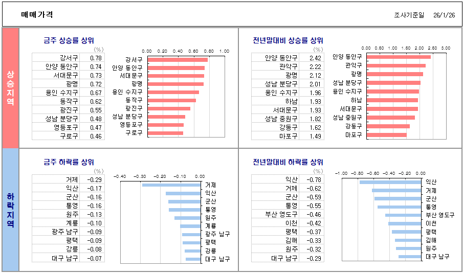 - 경기도 매매 상승 Top3 : 안양 동안구(0.74), 광명시(0.72), 용인 수지구(0.67)