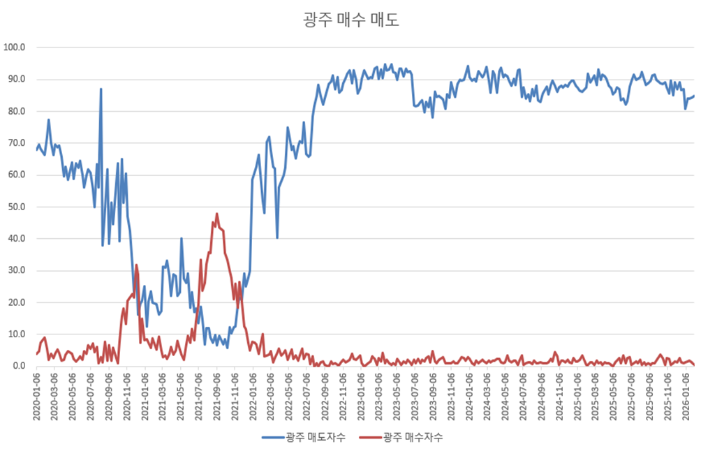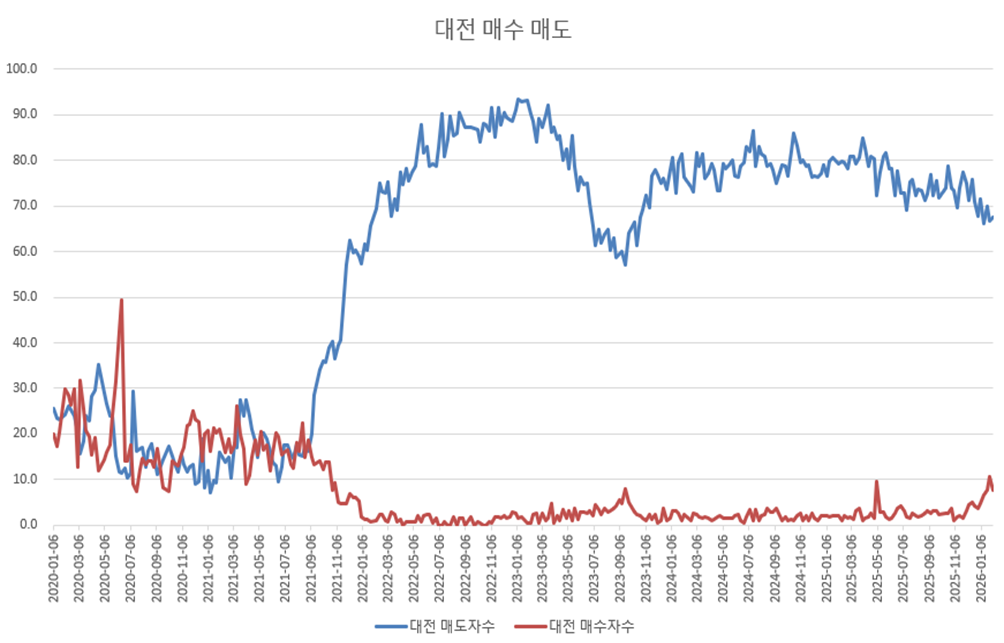 대전의 심리도 주춤하다. 역시나 매수세가 좀 더 크게 줄었고, 매도세는 큰 변화는 없다.