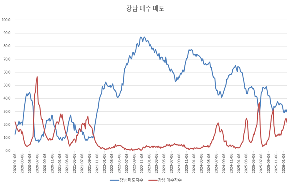 강남은 매수세가 좀 줄었고, 매도세는 약간 늘어나는 모습을 보인다.