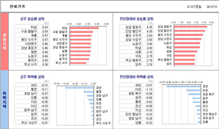 - 경기도 전세 상승 Top3 : 하남시(0.63), 수원 팔달구(0.50), 용인 수지구(0.47)